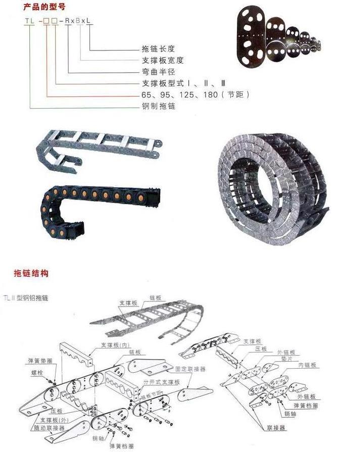 TL系列鋼制電纜拖鏈,銷軸及支撐板和隨動連接器等零件組成。拖鏈可適用最大移動速度為40米/分,拖鏈安全使用壽命不少于100萬次(往復(fù))。該產(chǎn)品具有設(shè)計精巧、使用靈活等特點,被廣泛應(yīng)用與冶金、鋼鐵、鑄造、大型機械等行業(yè)作為短距離,油、氣、水軟管和電纜同時移動之用。